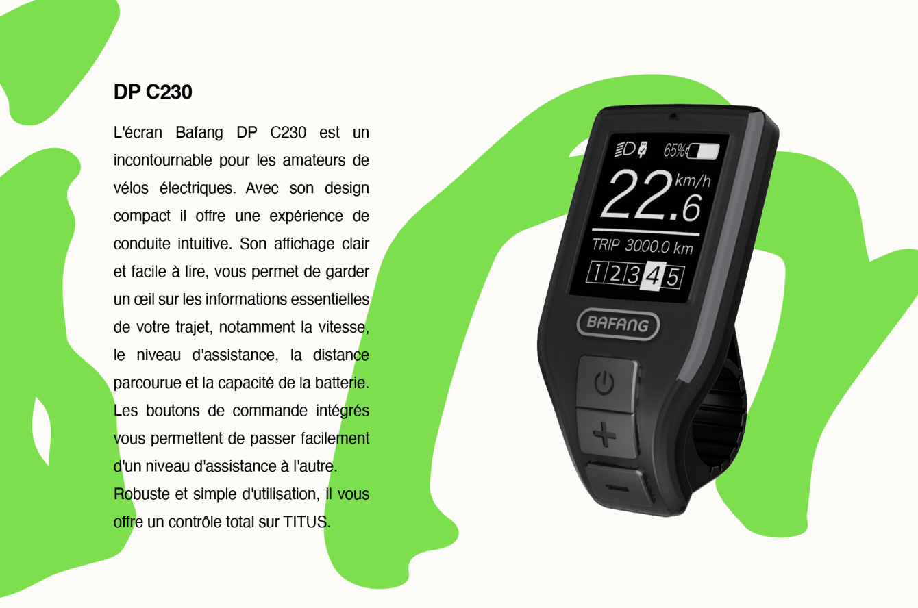 - Contrôleur et afficheur latéral BAFANG rétroéclairé affichant le niveau de batterie, vitesse, et la gestion du niveau d’assistance (5 niveaux disponibles)