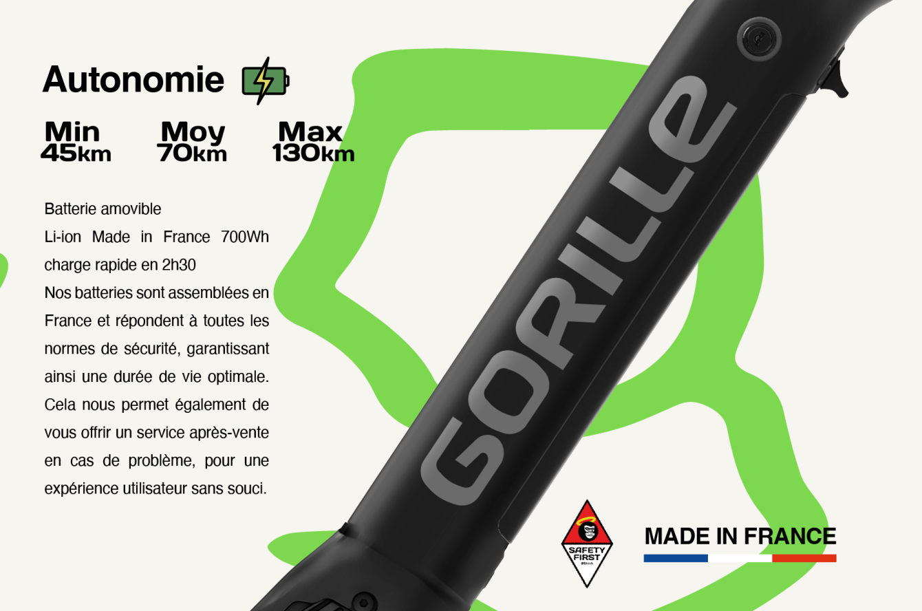 - Autonomie Jusqu’à 130 km dépendant, du niveau d’assistance, du dénivelé, du vent, du poids de l’ensemble pilote + Gorille…